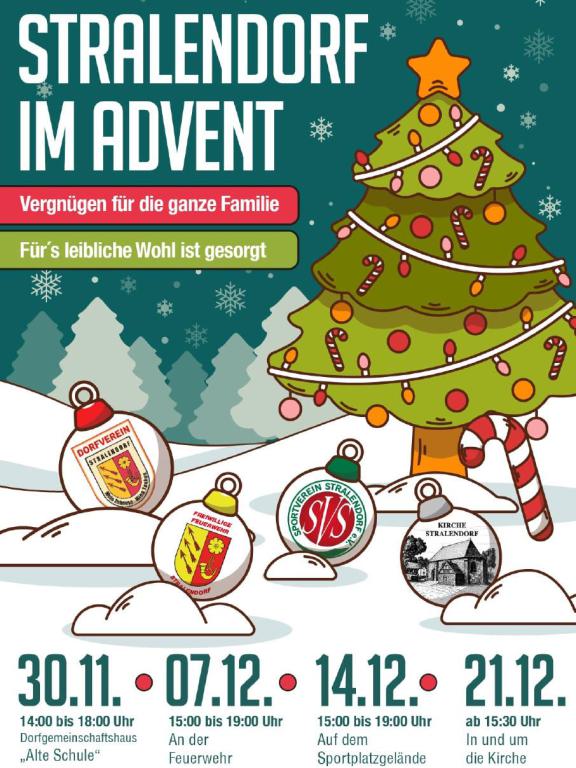Der Dorfverein 675 Jahre Stralendorf e.V. läd herzlich zu einem weihnachtlichen Programm mit dem bekannten Musiker und Entertainer Benjamin Nolze in das Dorfgemeinschaftshaus „Alte Schule“ ein. In festlicher Atmosphäre und unter dem Motto: „Sind die Lichtlein angezündet“ - hören wir humorvolle Geschichten und besinnliche Lieder.