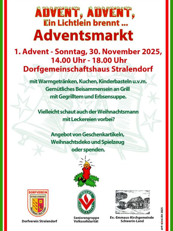 Der Dorfverein 675 Jahre Stralendorf e.V. läd herzlich zu einem weihnachtlichen Programm mit dem bekannten Musiker und Entertainer Benjamin Nolze in das Dorfgemeinschaftshaus „Alte Schule“ ein. In festlicher Atmosphäre und unter dem Motto: „Sind die Lichtlein angezündet“ - hören wir humorvolle Geschichten und besinnliche Lieder.