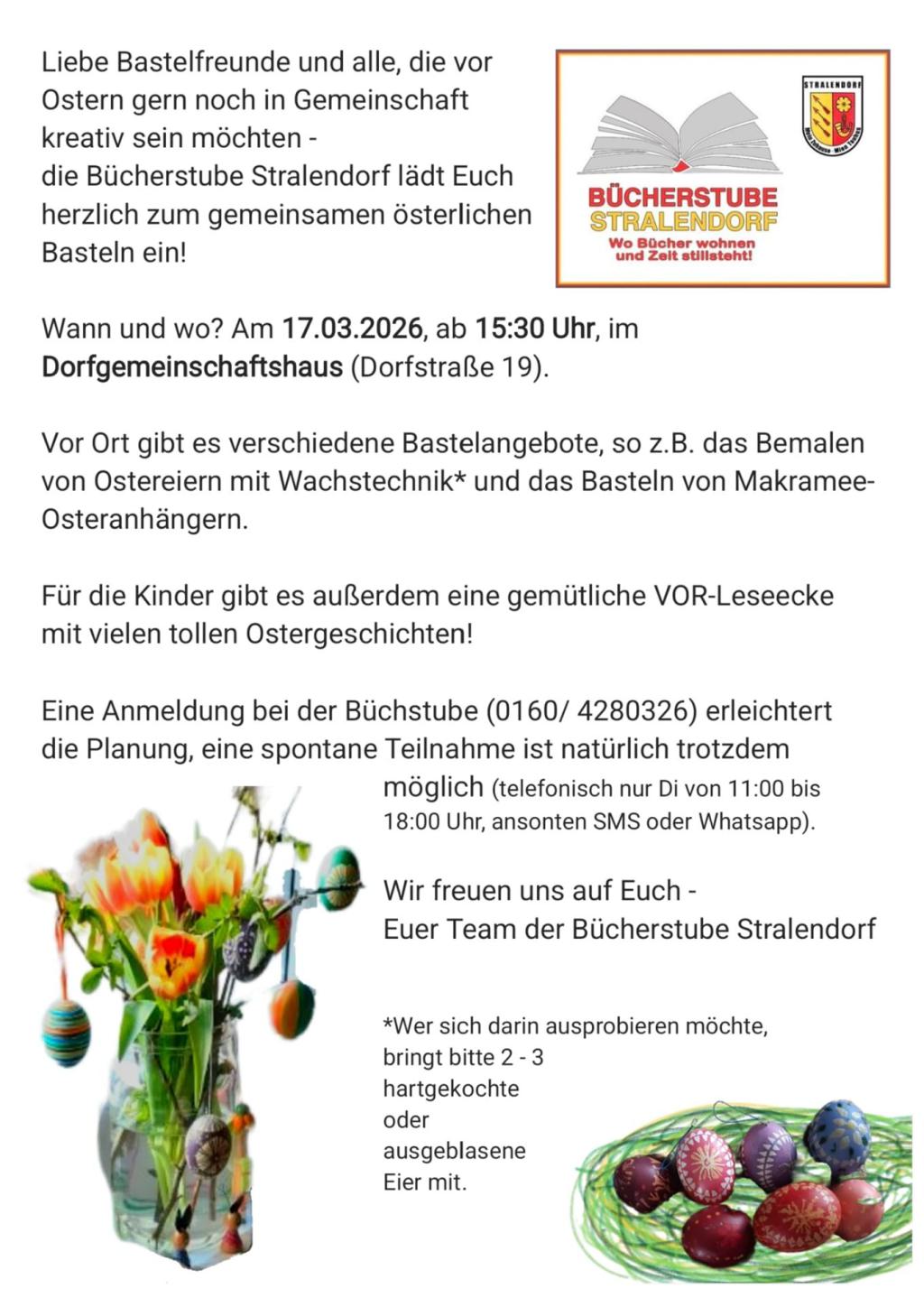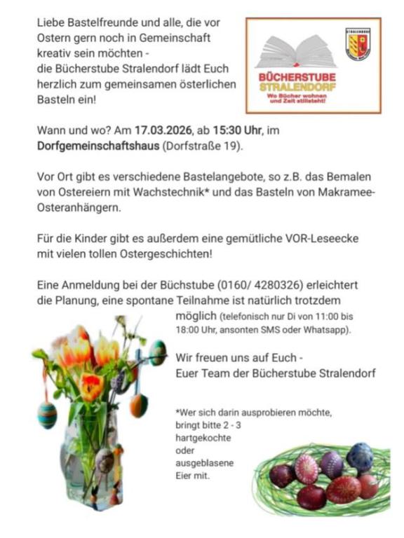 15:30 Osterbasteln im Dorfgemeinschaftshaus Stralendorf